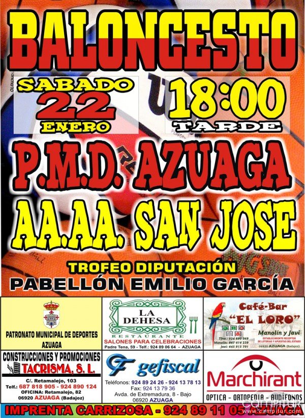 Este sábado os invitamos a todos a que os acerquéis al Pabellón Polideportivo “Emilio García” de Azuaga, donde se disputará un partido de baloncesto entre el equipo local, P.M.D. Azuaga, y AA.AA. San José.